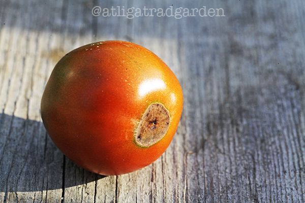 Ibland kan det uppstå bruna fläckar på tomaterna som börjar som en ljus liten fläck oftast i änden av tomaten och sen växer sig allt större och blir mörkbrun. Ibland kan nån enstaka extra känslig sort drabbas, men varma torra år kan problemet bli ganska utbrett och inte bara på tomater.